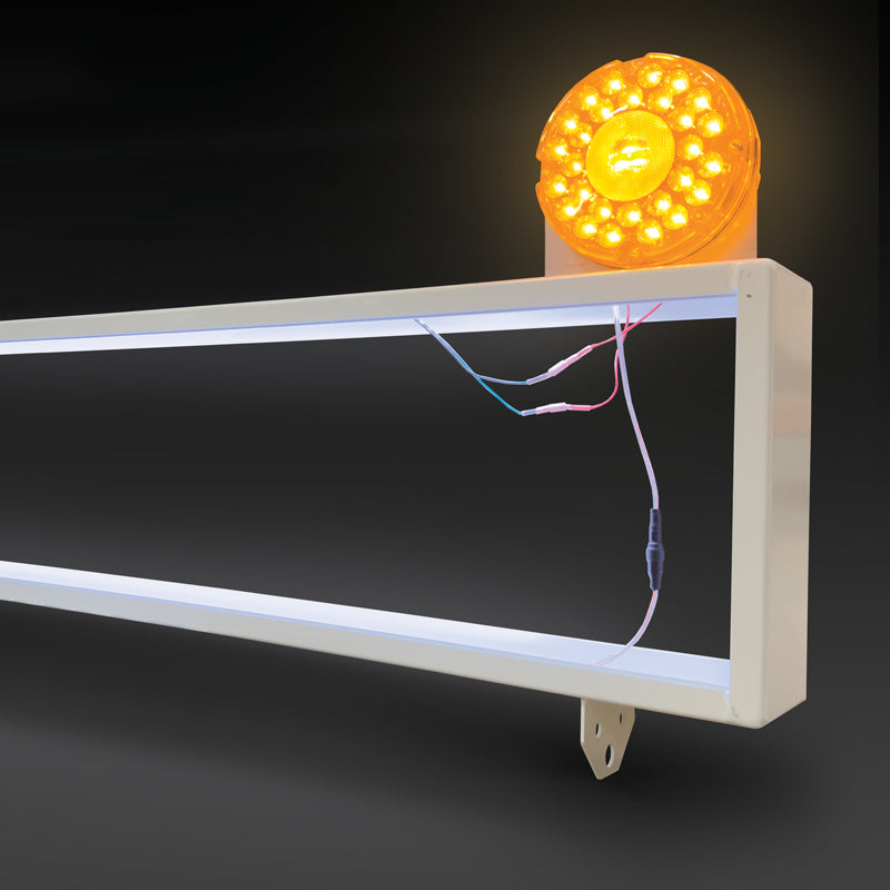 This rugged, back-lit sign frame is engineered for maximum visibility, durability, and performance. Constructed from heavy-duty 14-gauge metal and finished in a protective white powder-coated paint, the frame supports two illuminated sign inserts (sold separately) and is equipped with bright white LED sign lighting plus four amber LED corner lights—two facing forward, two facing rear. Designed primarily for pilot car use, it can also be mounted on service or utility vehicles to deliver critical information or provide a clear visual warning when in transit or parked at the roadside.